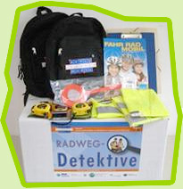 Die Radweg-Detektivkisten sind konzipiert für die Jahrgangsstufen fünf und sechs an weiterführenden Schulen. In den Rucksäcken finden die Schüler Unterrichtsmaterialien, Fragebögen, Maßband und Stoppuhr um ihre Alltags- und Freizeitwege mit dem Rad zu untersuchen. Sie führen Verkehrszählungen durch, messen Radwege und untersuchen Abstell-anlagen. Gemeinsam mit der Stadtverwaltung sollen anschließend für die ermittelten Gefahrenpunkte Lösungsmöglichkeiten ausgearbeitet werden.